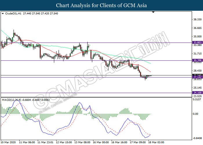 CrudeOIL, H1: Crude oil price was traded within a range while currently testing the support level at 27.15. MACD which illustrated diminishing bearish momentum suggest the commodity to be traded higher in short-term as technical correction.
