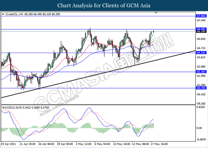 CrudeOIL, H4: Crude oil price was traded higher while currently testing the resistance level 66.60. MACD which illustrate ongoing bullish momentum signal suggest the commodity to extend its gains after it breaks above the resistance level 66.60.