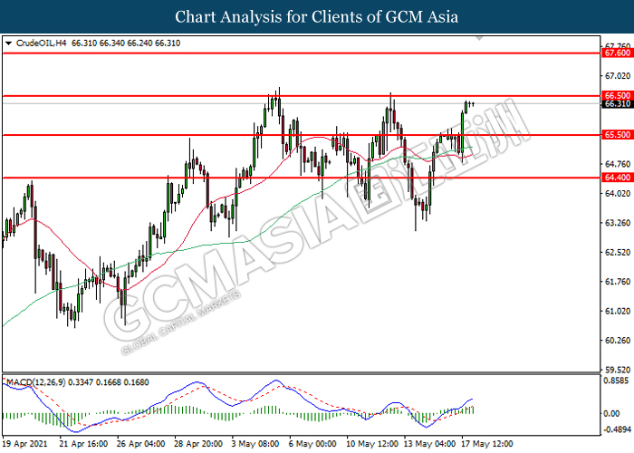 CrudeOIL, H4: Crude oil price was traded higher following prior rebound from the lower level. MACD which illustrated bullish momentum suggest the commodity to extend its gains after breaking the resistance level at 66.50.
