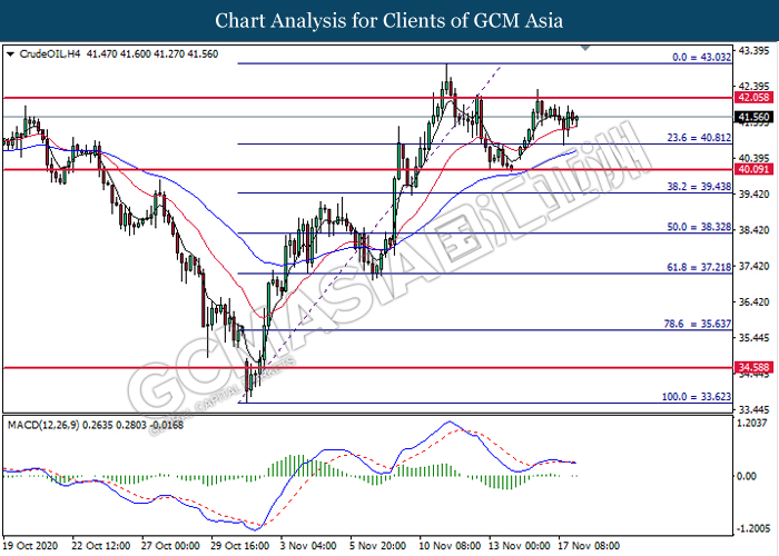 CrudeOIL, H4: Crude oil price was traded higher following prior rebound from the 20 moving average line (Red). Due to lack of signal from MACD, it is suggested to wait for further confirmation such as breakout before entering into the market.