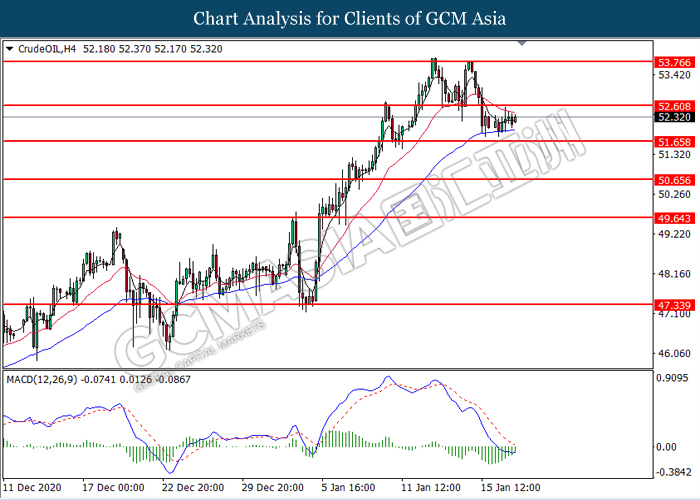 CrudeOIL, H4: Crude oil price was traded higher following prior rebound near the support level at 51.65. MACD which illustrated diminishing bearish momentum suggest the commodity to extend its gains toward the resistance level at 52.60.