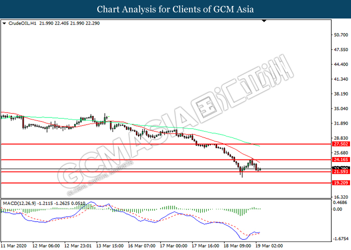 CrudeOIL, H1: Crude oil price was traded lower while currently testing the support level at 21.60. MACD which illustrated diminishing bullish momentum suggest the commodity to extend its losses after it successfully breakout below the support level.