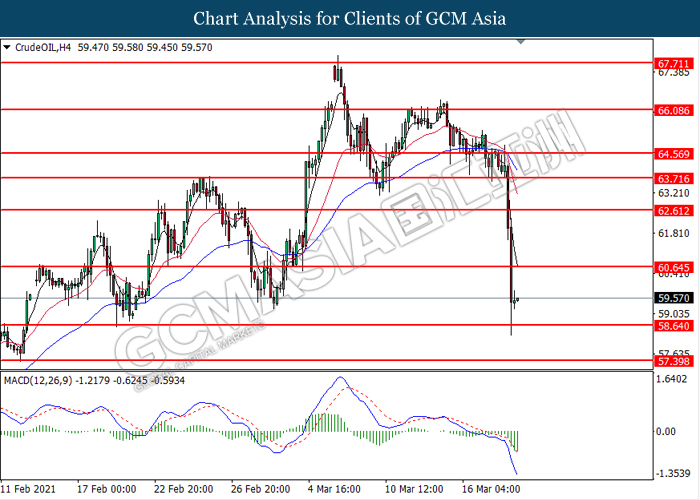 CrudeOIL, H4: Crude oil price was traded higher following prior rebound from the support level at 58.65. However, MACD which illustrated bearish bias momentum suggest the commodity to undergo technical correction in short term.