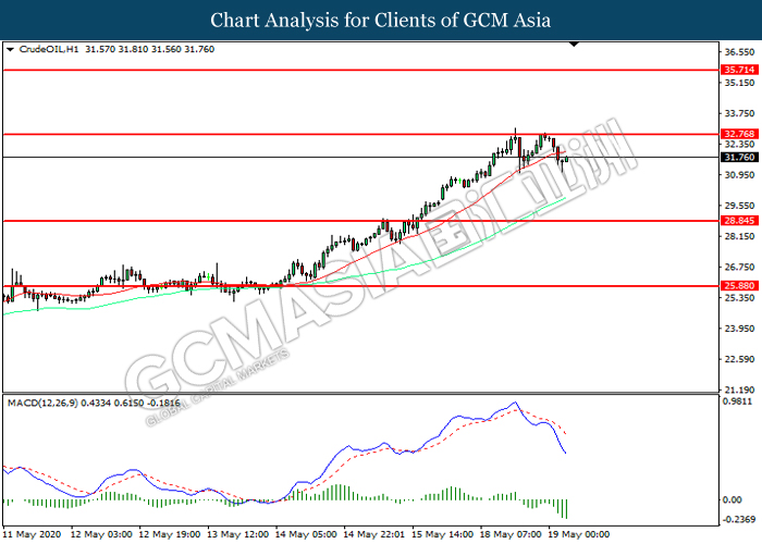 CrudeOIL, H1: Crude oil price was traded lower following prior retracement from the resistance level at 32.75. MACD which illustrated increasing bearish momentum suggest the commodity to extend its losses toward support level at 28.85.