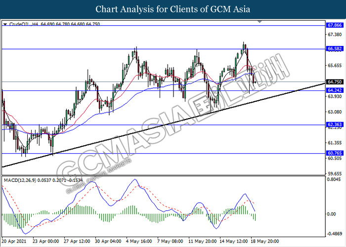 CrudeOIL, H4: Crude oil price was traded lower while currently testing near the support level 64.25. MACD which illustrate bearish momentum signal with the formation of death cross suggest the commodity to extend its losses after it breaks below the support level.