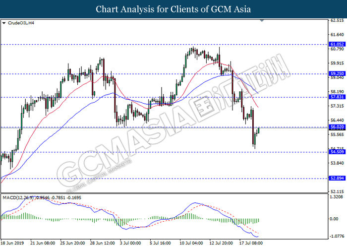 CrudeOIL, H4: Crude oil price was traded higher while currently testing the resistance level 56.00. MACD which illustrate diminishing bearish momentum suggest the commodity to extend its gains after it successfully breaks above the resistance level.