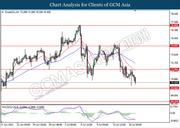 CrudeOIL, H4: Crude oil price was traded lower while currently testing the near support level 69.85. MACD which illustrate ongoing bearish momentum signal suggest the pair to extend its losses after it breaks below the support level.