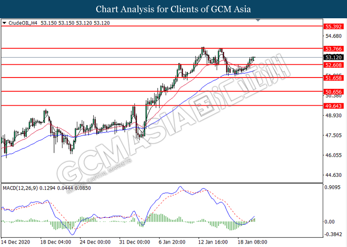 CrudeOIL, H4: Crude oil price was traded higher following prior breakout above the previous resistance level at 52.60. MACD which illustrated bullish bias momentum suggest the commodity to extend its gains toward the resistance level at 53.75.