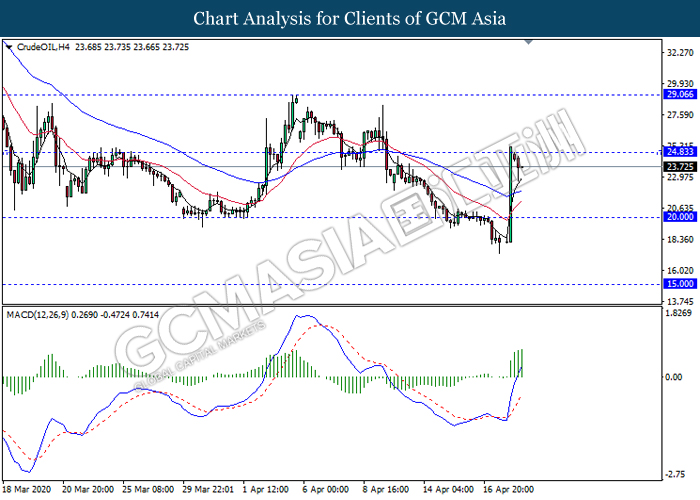 CrudeOIL, H4: Crude oil price was traded higher while currently testing near the resistance level 24.85. MACD which illustrate ongoing bullish momentum suggest the commodity to extend its gains after it breaks above the resistance level 24.85.