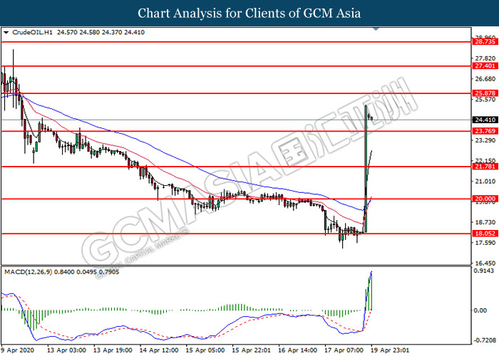 CrudeOIL, H1: Crude oil price was traded lower following prior retracement from the higher level. However, MACD which illustrate bullish bias momentum suggest the commodity to extend undergo technical correction toward the higher level.