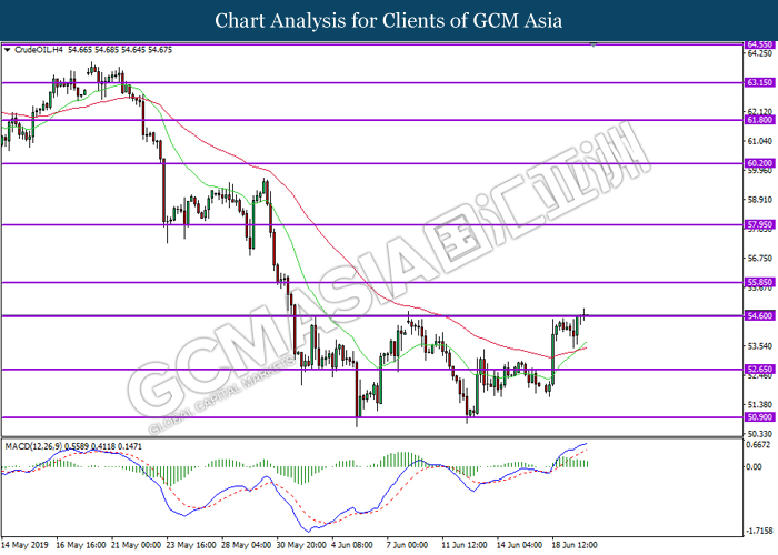 CrudeOIL, H4: Crude oil price was traded higher while currently testing the resistance level 54.60. However, MACD which illustrate diminishing bullish momentum suggest the commodity to undergo short-term technical correction and retrace back towards the support level 52.65.