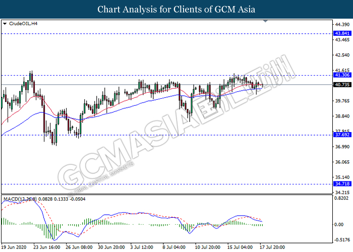 CrudeOIL, H4: Crude oil price was traded flat near the resistance level 41.30. However MACD which display bearish momentum signal suggest the commodity to be traded lower towards the support level 37.70.