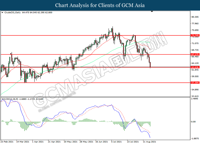 CrudeOIL, Daily: Crude oil price was traded lower while currently testing the support level at 62.65. MACD which illustrated increasing bearish momentum suggest the commodity to extend its losses after it successfully breakout below the support level.