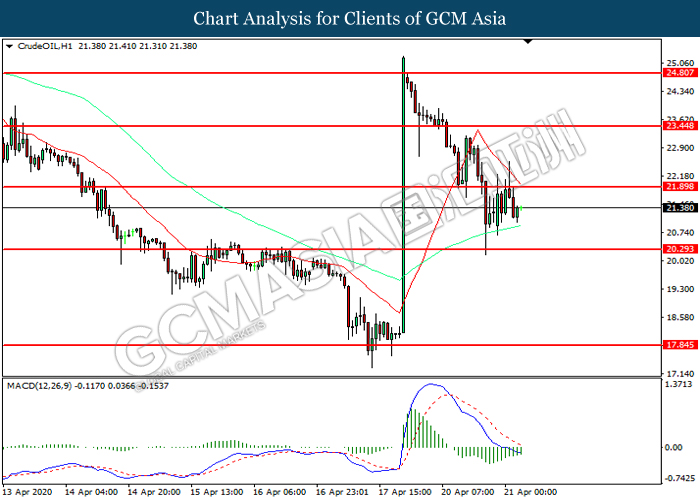 CrudeOIL, H1: Crude oil price was lower following prior retracement from the resistance level at 21.90. However, MACD which illustrated diminishing bearish momentum suggest the commodity to be traded higher in short-term as technical correction.