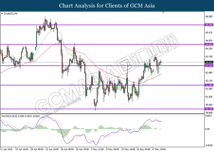 CrudeOIL, H4: Crude oil price was traded higher following prior rebound from the support level 63.15. MACD which illustrate bullish bias signal suggest the commodity to extend its gains towards the resistance level 64.65.