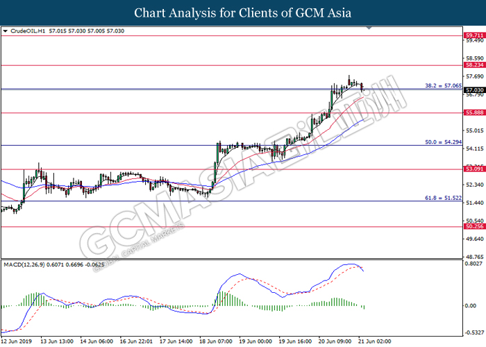 CrudeOIL, H1: Crude oil price was traded lower while currently testing the support level 57.05. MACD which illustrate bearish momentum with the formation of death cross suggest the commodity to extend its losses after successfully breaking below the support level.