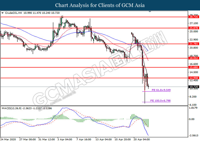 CrudeOIL, H4: Crude oil price was traded lower following prior breakout below the previous support level at 12.95. MACD which illustrate bearish bias momentum suggest the commodity to extend its losses toward the support level at 9.55.
