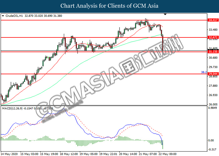 CrudeOIL, H1: Crude oil price was traded lower while currently testing the support level at 31.25. MACD which illustrated increasing bearish momentum suggest the commodity to extend its losses after it successfully breakout below the support level.