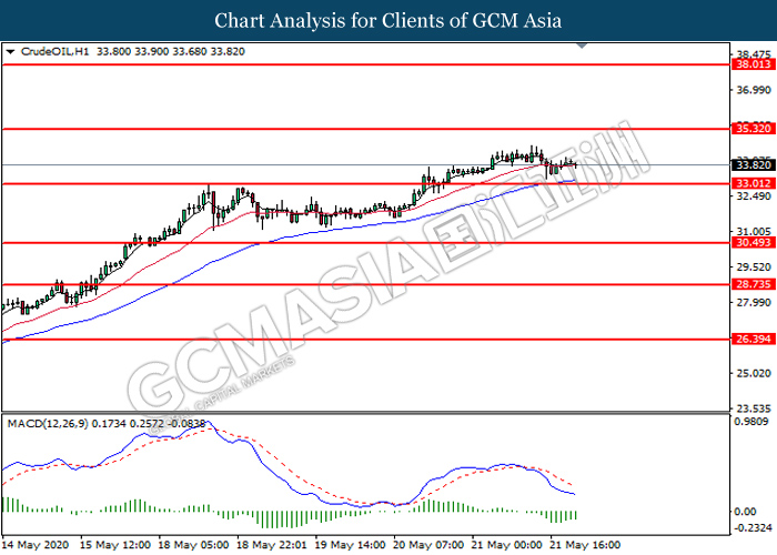 CrudeOIL, H1: Crude oil price was traded higher following prior rebound from the lower level. MACD which illustrate diminishing bearish momentum suggest the commodity to extend its gains toward the resistance level at 35.30.