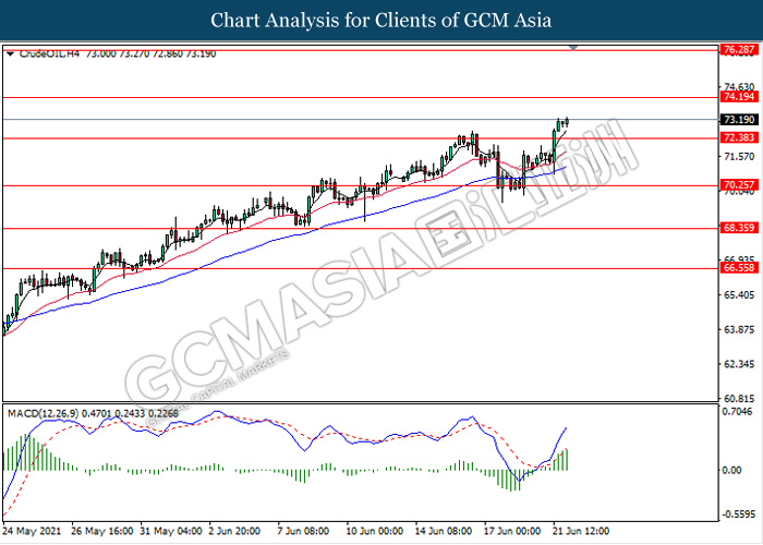 CrudeOIL, H4: Crude oil price was traded higher following prior breakout above the previous resistance level 72.40. MACD which display ongoing bullish momentum signal suggest the commodity to extend its gains after it breaks above the resistance level 74.20.