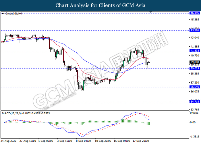 CrudeOIL, H4: Crude oil price was traded lower while currently testing near the support level 39.00. MACD which display bearish momentum signal with the recent formation of death cross suggest the commodity to extend its losses after it breaks below the support level 39.00.