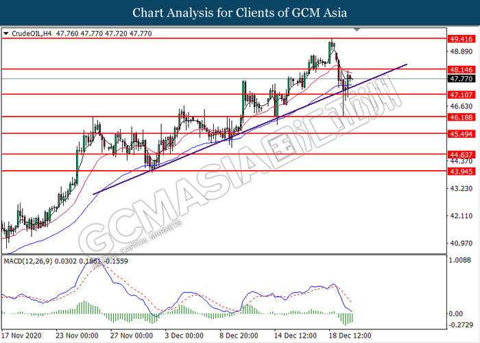 CrudeOIL, H4: Crude oil price was traded higher following prior rebound from the upward trendline. MACD which illustrated diminishing bearish momentum suggest the commodity to extend its gains toward the resistance level at 48.15.