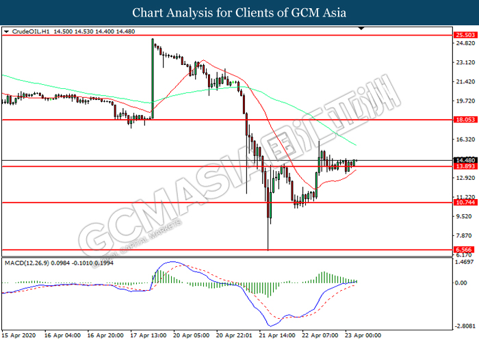 CrudeOIL, H1: Crude oil price was traded within a range while currently testing the support level at 13.90. However, MACD which illustrated diminishing bullish momentum suggest the commodity to be traded lower after it successfully breakout below the support level.