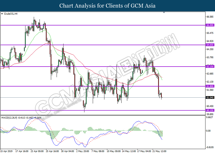 CrudeOIL, H4: Crude oil price was traded lower following prior breakout below the previous support level 61.80. MACD which illustrate persistent bearish momentum suggest the commodity to extend its losses towards the support level 60.15.