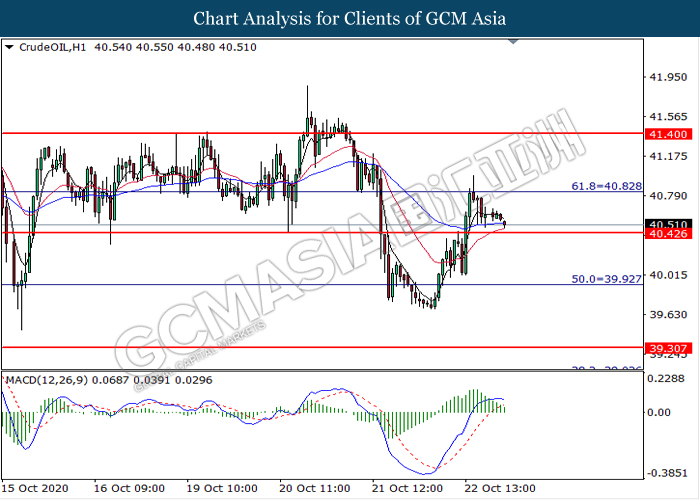 CrudeOIL, H1: Crude oil price was traded lower following prior retracement from the resistance level at 40.85. MACD which illustrate diminishing bullish momentum signal suggest the commodity to extend its losses toward the support level at 40.45.