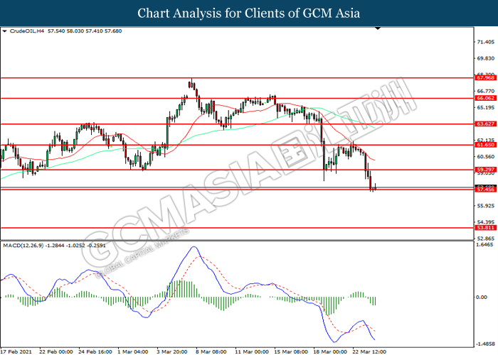 CrudeOIL, H4: Crude oil price was traded lower while currently testing the support level at 57.45. MACD which illustrated increasing bearish momentum suggest the commodity to extend its losses after it successfully breakout below the support level.