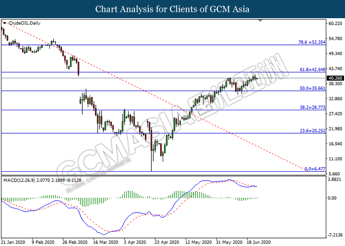 CrudeOIL, Daily: Crude oil price was traded higher while currently near the resistance level at 42.55. MACD which illustrated diminishing bearish momentum suggest the commodity to extend its gains after it successfully breakout above the resistance level.