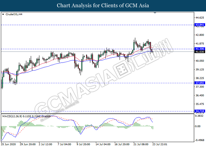 CrudeOIL, H4: Crude oil price was traded lower following prior breakout below the support level 41.30. MACD which display bearish bias signal with the formation of death cross suggest the commodity to extend its losses towards the support level 37.70.