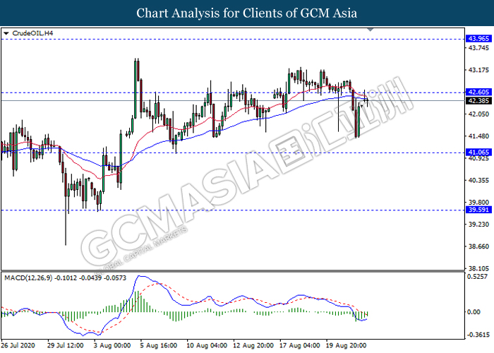 CrudeOIL, H4: Crude oil price was traded higher while currently testing the resistance level 42.60. MACD which illustrate diminishing bearish bias signal suggest the commodity to extend its gains after it breaks above the resistance level.