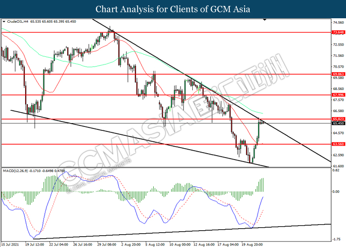 CrudeOIL, H4: Crude oil price was traded higher while currently testing the resistance level at 65.80. MACD which illustrated increasing bullish momentum suggest the commodity to be traded lower in short-term as technical correction.