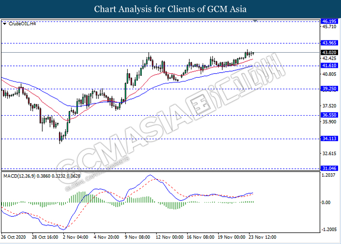 CrudeOIL, H4: Crude oil price was traded higher following recent rebound from the support level 41.60. MACD which illustrate ongoing bullish momentum signal suggest the commodity to extend its gains towards the resistance level 43.95.