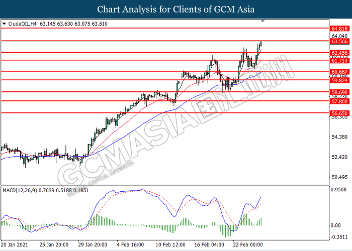 CrudeOIL, H4: Crude oil price was traded higher while currently testing the resistance level at 63.55. MACD which illustrated bullish bias momentum suggest the commodity to extend its gains after it successfully breakout above the resistance level.