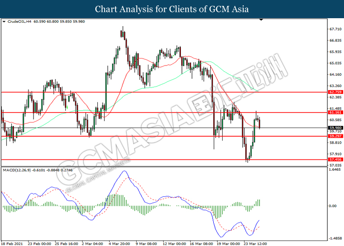 CrudeOIL, H4: Crude oil price was traded lower following prior retracement from the resistance level at 61.15. However, MACD which illustrated increasing bullish momentum suggest the commodity to be traded higher in short-term as technical correction.