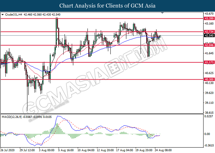 CrudeOIL, H4: Crude oil price was traded higher following prior rebound from the lower level. MACD which illustrate diminishing bearish momentum suggest the commodity to extend its gains toward the resistance level at 42.75.