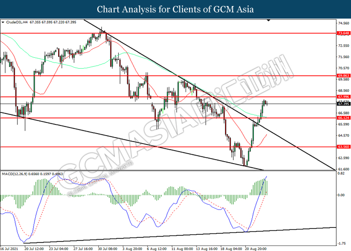 CrudeOIL, H4: Crude oil price was traded higher while currently testing the resistance level at 68.00. MACD which illustrated increasing bullish momentum suggest the commodity to extend its gains after it successfully breakout above the resistance level.