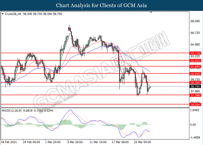 CrudeOIL, H4: Crude oil price was traded higher following prior rebound from the support level at 57.40. However, MACD which illustrated diminishing bullish momentum suggest the commodity to undergo technical correction in short term.