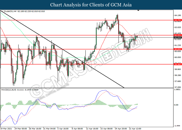 CrudeOIL, H4: Crude oil price was traded higher while currently testing the resistance level at 62.20. MACD which illustrated increasing bullish momentum suggest the commodity to extend its gains after it successfully breakout above the resistance level.