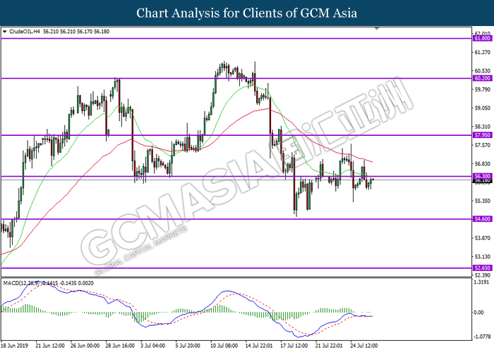 CrudeOIL, H4: Crude oil price was traded higher while currently testing near the resistance level 56.30. However, due to lack of signal and momentum from the MACD, a breakout above or retracement from the resistance level is required to obtain further confirmation before entering the market.