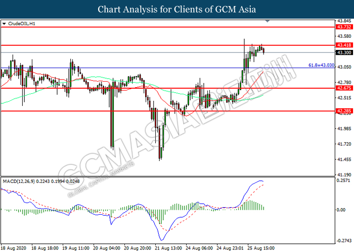 CrudeOIL, H1: Crude oil price was higher while currently testing the resistance level at 43.40. However, MACD which illustrated diminishing bullish momentum suggest the commodity to be traded lower in short-term as technical correction.