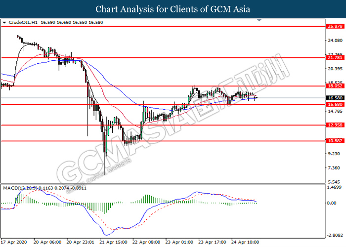 CrudeOIL, H1: Crude oil price was traded lower following prior retracement from the higher level. MACD which illustrate bearish bias momentum suggest the commodity to extend its losses toward the support level at 15.70.