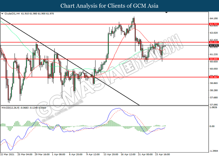 CrudeOIL, H4: Crude oil price was traded higher while currently testing the resistance level at 62.20. MACD which illustrated increasing bullish momentum suggest the commodity to extend its gains after it successfully breakout above the resistance level.