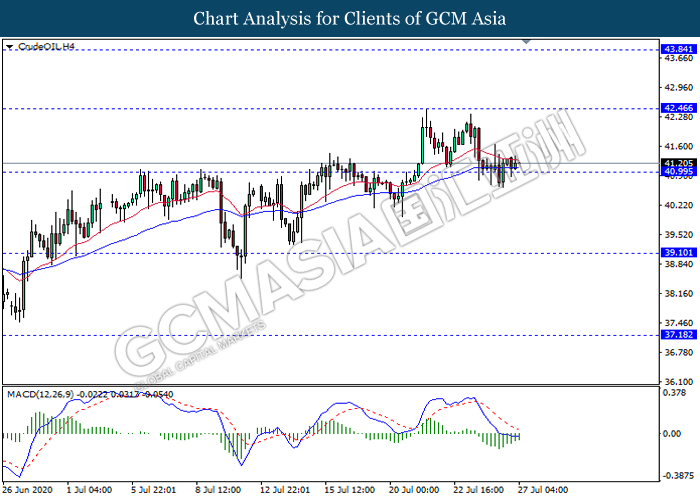 CrudeOIL, H4: Crude oil price was traded flat near the current support level 41.00. However, MACD which illustrate diminishing bearish momentum signal suggest the commodity to be traded higher in short term towards the resistance level 42.45.