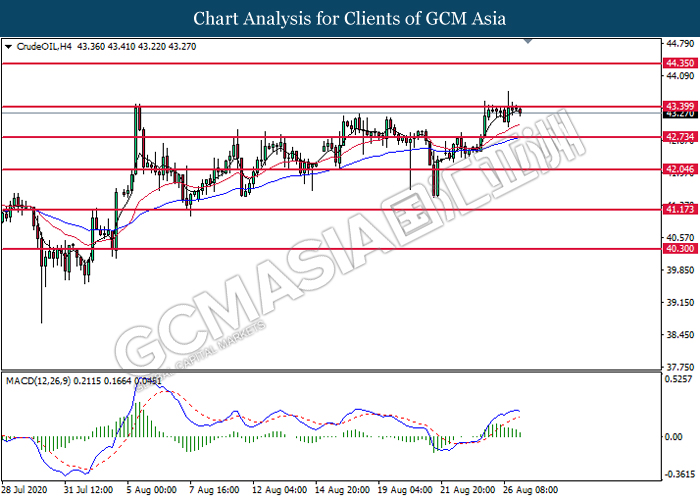 CrudeOIL, H4: Crude oil price was traded higher while currently testing the resistance level at 43.40. However, MACD which illustrate diminishing bullish momentum suggest the commodity to extend its losses toward the support level at 42.75.