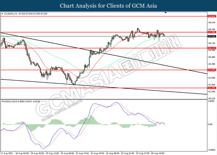 CrudeOIL, H4: Crude oil price was traded higher while currently testing the resistance level at 68.00. However, MACD which illustrated bearish momentum suggest the commodity to be traded lower in short-term as technical correction.