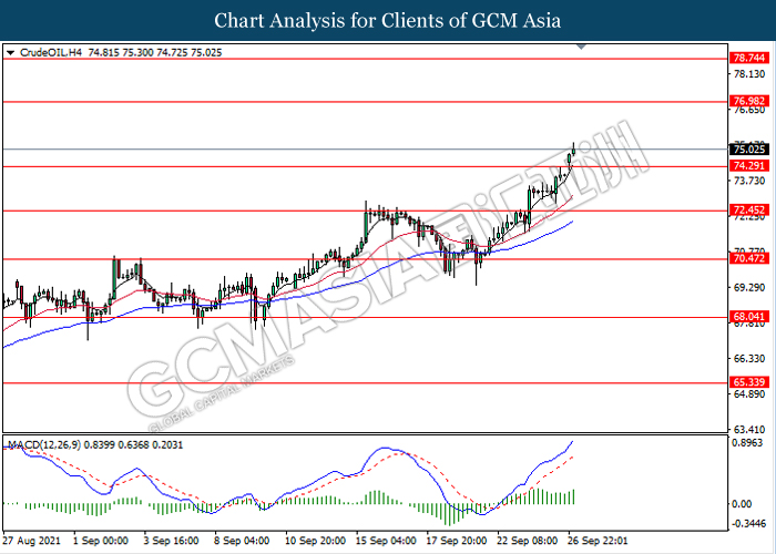 CrudeOIL, H4: Crude oil price was traded higher following prior breakout above the previous resistance level 74.30. MACD which illustrate persistent bullish momentum signal suggest the commodity to extend its gains towards the resistance level 77.00.