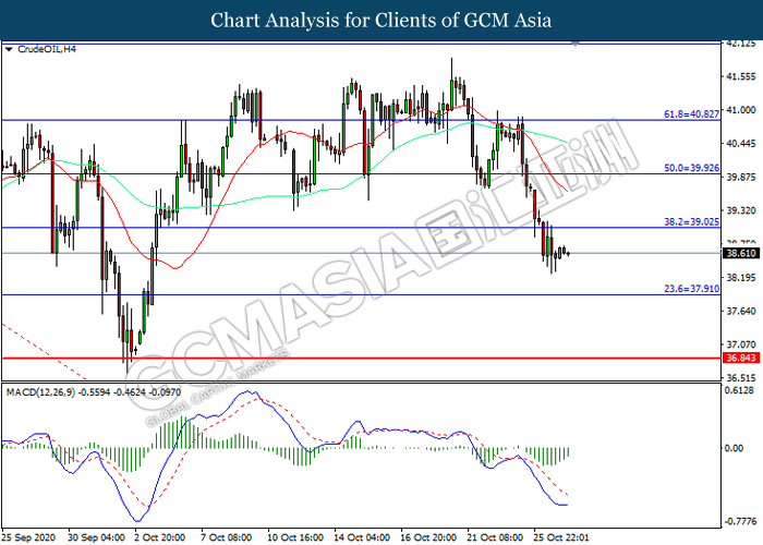 CrudeOIL, H4: Crude oil price was traded lower following prior breakout below the previous support level at 39.05. However, MACD which illustrated diminishing bearish momentum suggest the commodity to be traded higher in short-term as technical correction.